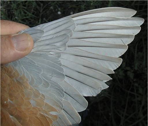 This color is co-dominate with the Senegal's normal or wild coloration. Breeding a Tangerine Senegal (any sex) to a normal colored Senegal will produce both Wild Type & Tangerine colored offspring. This color mutation acts just as it does in the common Ringneck Dove (Streptopelia risoria). Breeding Tangerine to Tangerine will produce a percentage of "pearled" offspring. To date no "pearled" young have been produced; although 2003 should see the first "pearled" young produced in the original breeder's stock.
