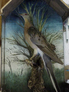 The Pigeon is housed in an beautiful original octagonal wood and glass case. There is a mural painted on the inside back of the case. It perches on a natural branch of what appears to be Winged Elm and "real" lichens were used to adorn the base of the painting to resemble the tree's bark. The taxidermist truly did a superb job in every aspect of preparation of this display. Surely even then he must have known what a treasure he had as he obviously devoted lots of time and effort to complete the work. The bird's plumage is in superb condition. The pose is very realistic. And its eyes! its eyes are even the correct color, bright red! This is a beautiful specimen and so well done, that it really looks like it's alive. And just think for a minute, this Passenger Pigeon is well over 111 years old! It is truly an awesome bird to behold!
